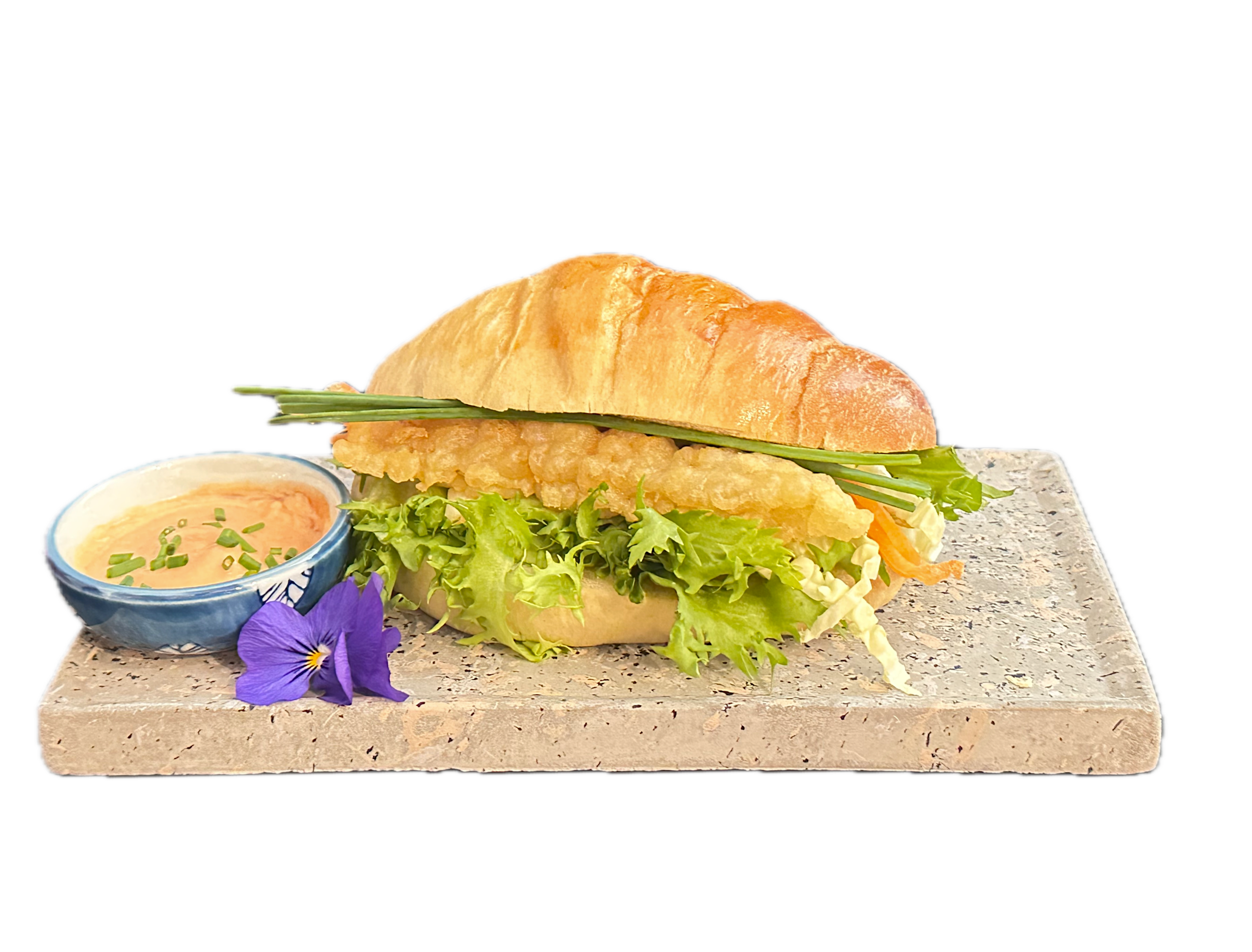 Bocadillo estilo Vietnamita de langostino en tempura, lechuga, encurtidos y salsa de kimchi
