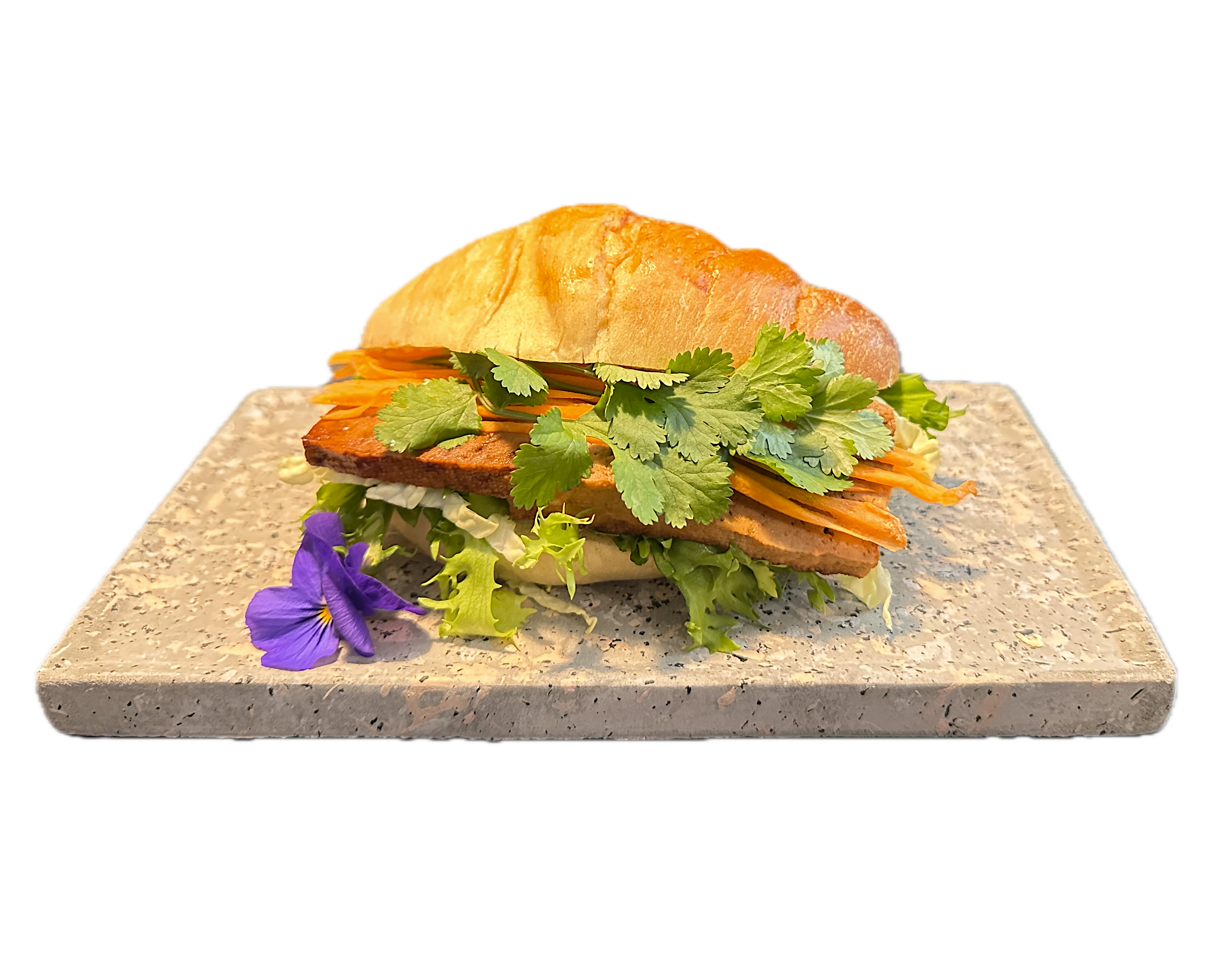 Bocadillo estilo Vietnamita de tofu marinado en soja y miel con encurtido de zanahoria, repollo, cilantro y salsa casera